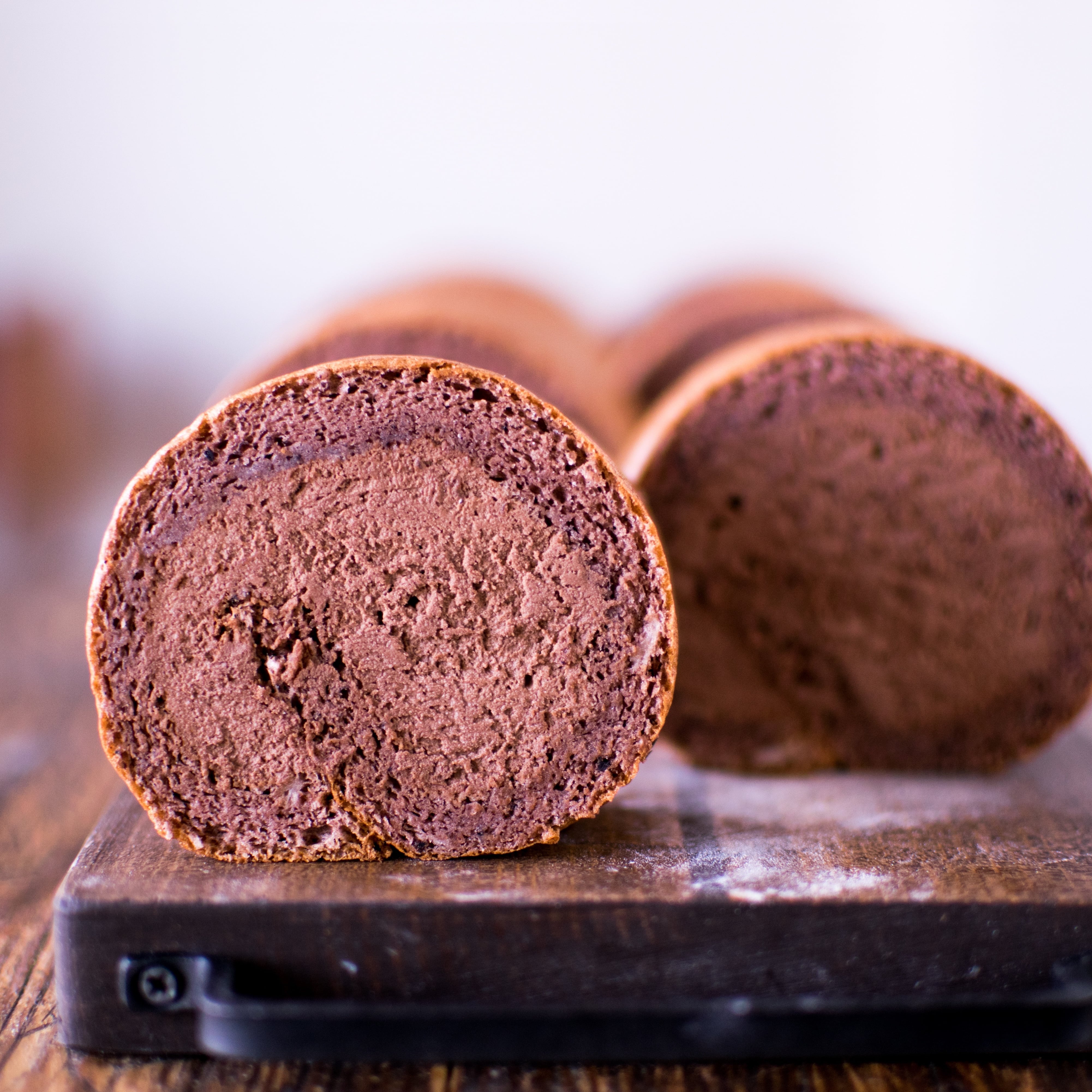 ココアの生地にビターなチョコレートクリームを巻き込んでつくったロールケーキです。